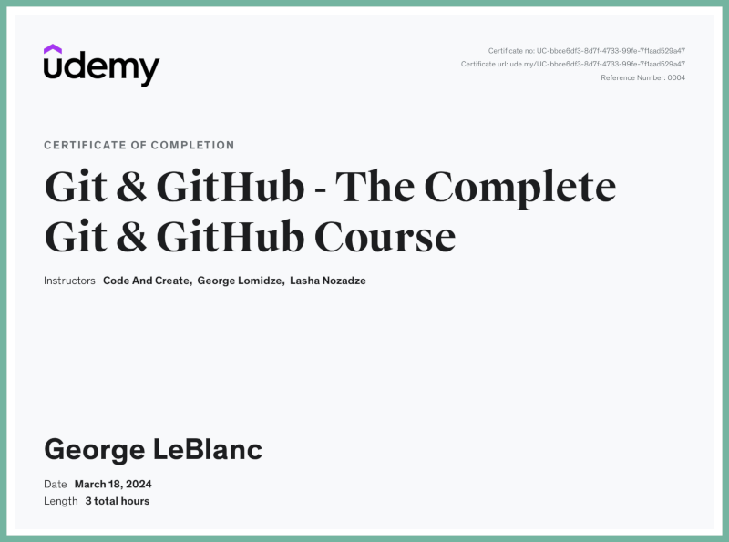 Home » Git & GitHub- The Complete Git & GitHub Course Posted in Supplemental Training DocumentsGit & GitHub- The Complete Git & GitHub Courseby gcoanx•March 18, 2024August 11, 2025 Awarded March 18, 2024 from Udemy